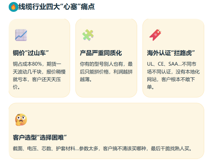 哈喽,我是跑遍全国线缆产区的小新!上周在福建拜访客户,刚走进车间就撞见老板跟采购经理争执:“欧盟的 CE 认证还没下来,东南亚的订单又催着发货,人家要本地服务器的官网查资质,我们这谷歌翻译的页面根本拿不出手!” 旁边技术总监叹了口气:“更头疼的是新能源电缆的订单,客户要耐高低温、抗老化的定制款,我们跟着改了三次工艺,结果铜价又涨了,报价刚发过去就被嫌贵...”